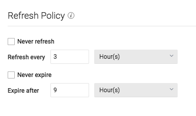 data-sourcesassetsrefresh-policyVersion: 0.0.1refresh-policyNever refresh -- Specifies how often to refresh based on hours, days, weeks, or never.Never expire -- Specifies how often to expire based on hours, days, weeks, or never.