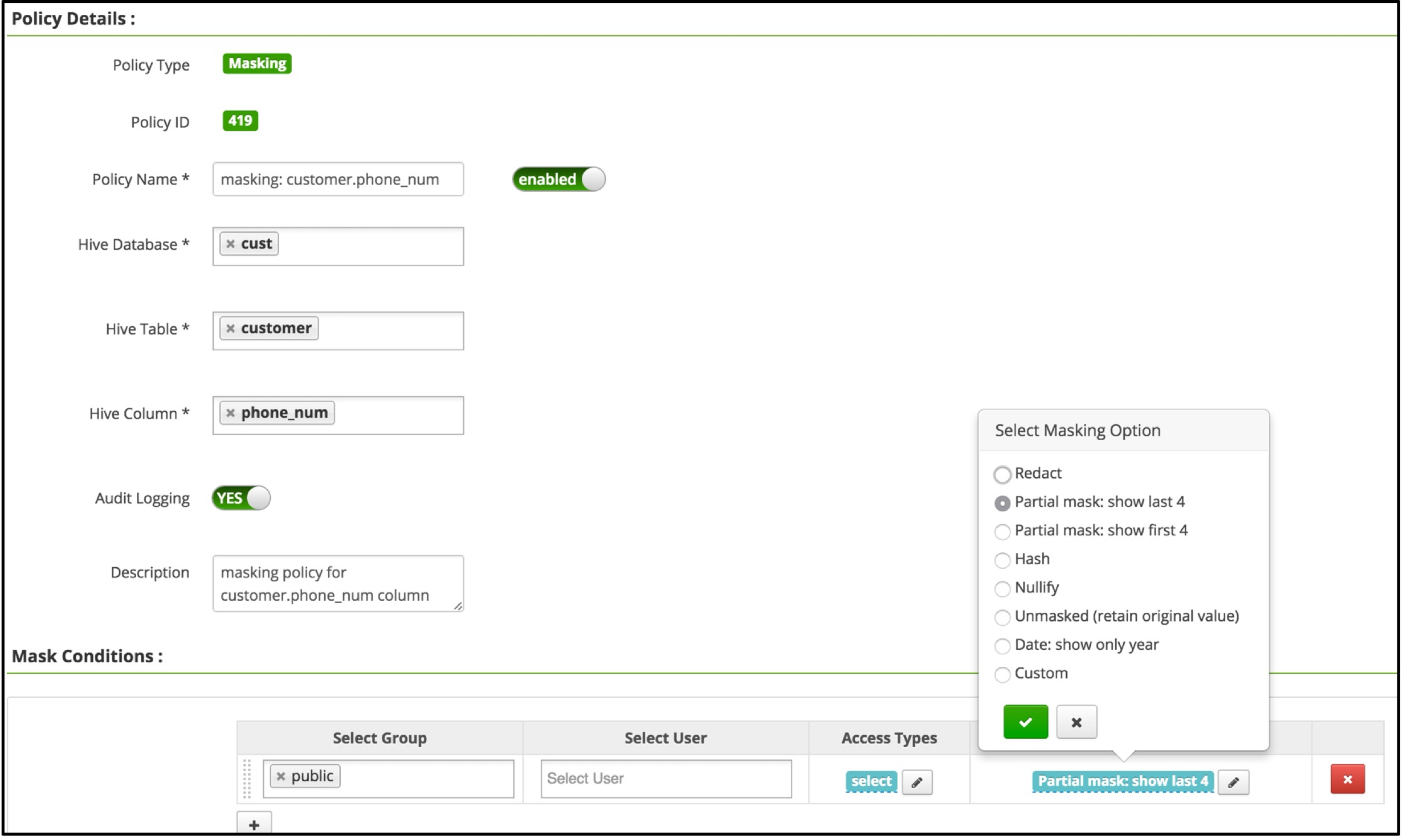This section outlines how to create a column-masking policy from the Apache Ranger console.