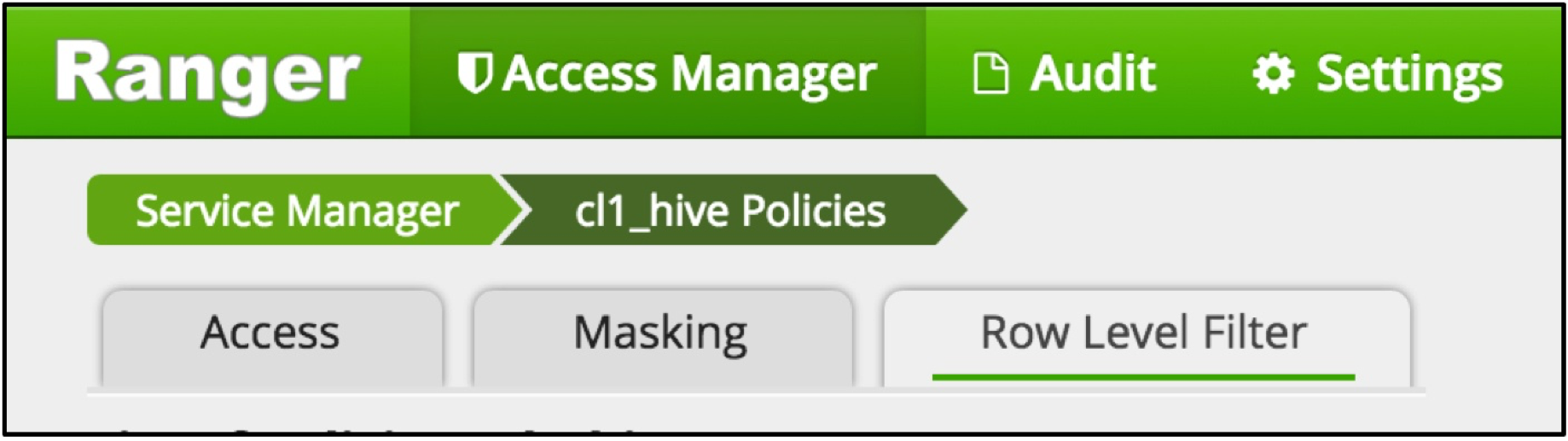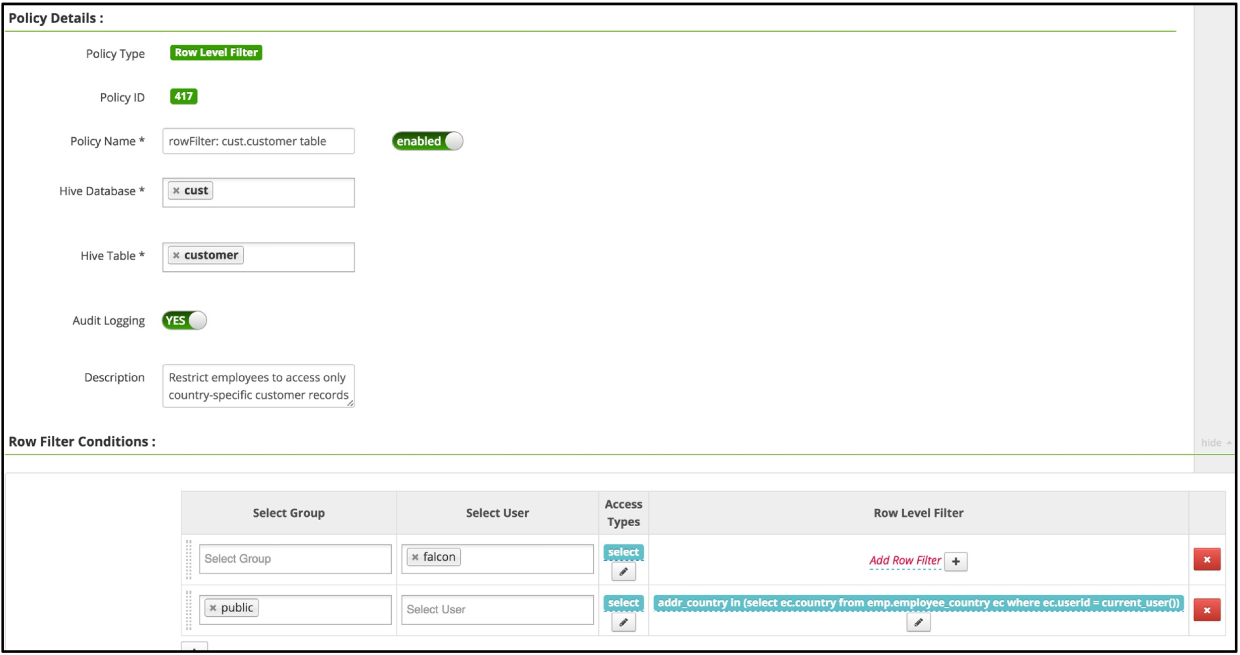 For Apache Ranger implementations, additional use cases may be found at 2. Use cases: row-level filters.