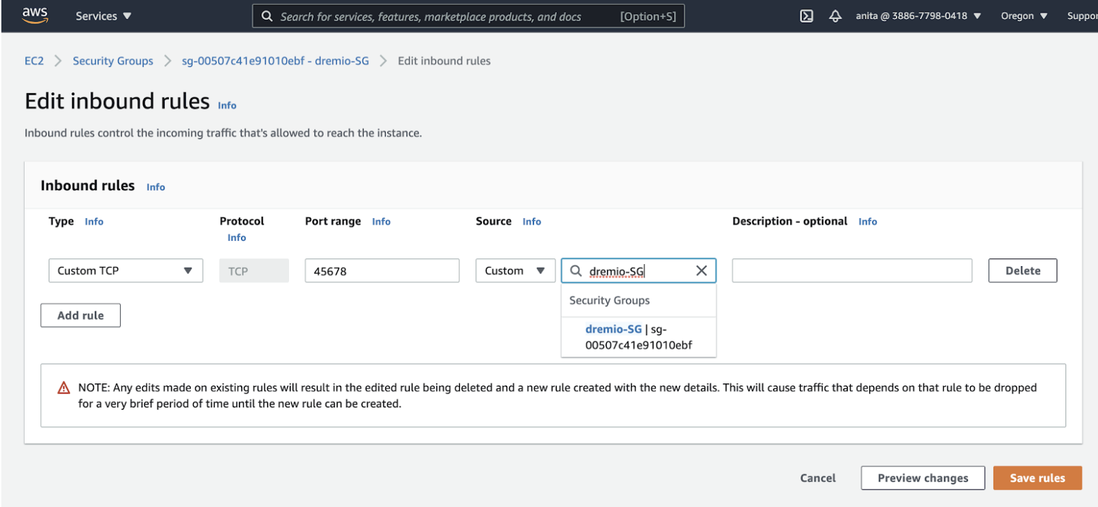 Find the security group you created in the previous step (for example dremio-SG) and select the Edit inbound rules button in the bottom left.