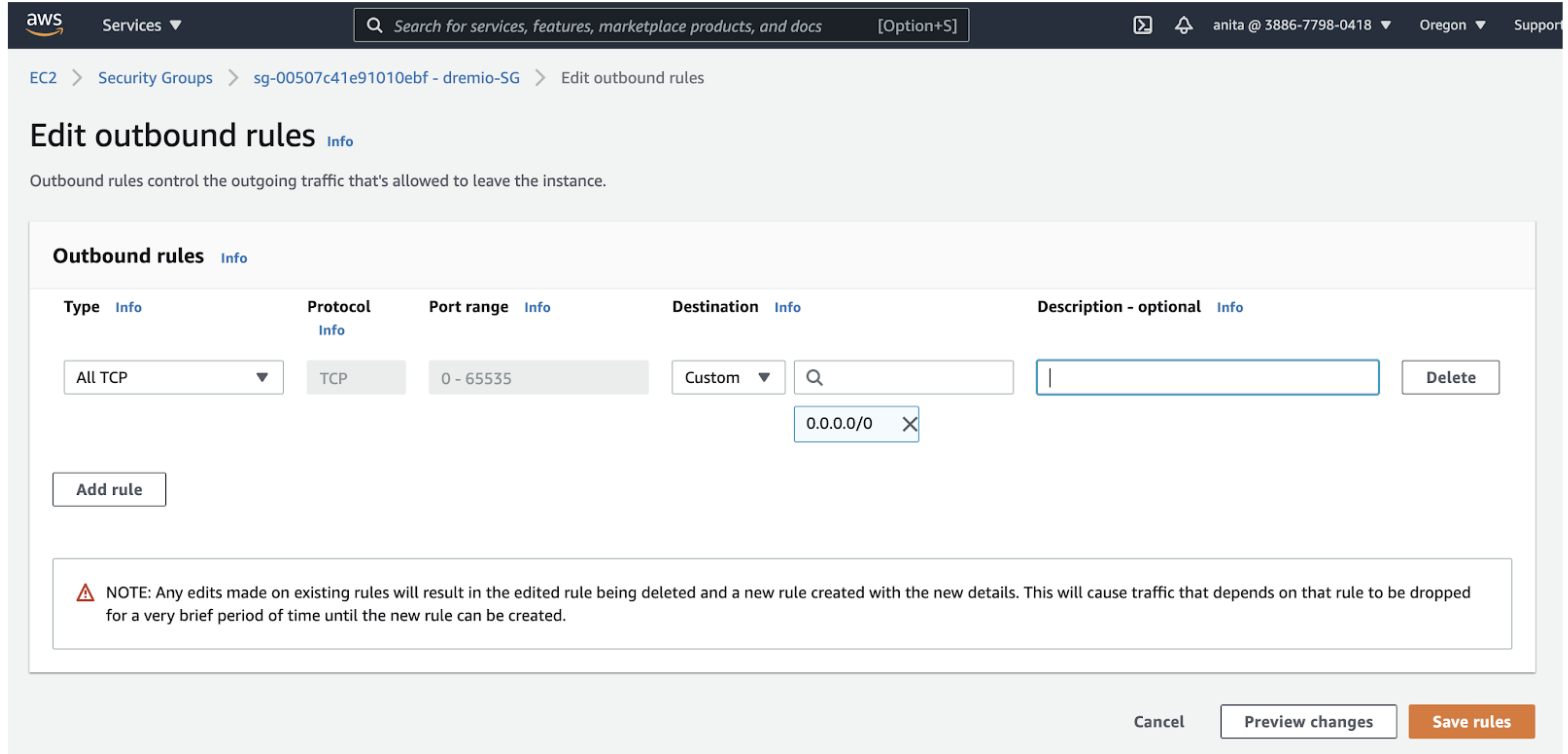 - Find the security group you created (for example dremio-SG) and click the Outbound rules tab.