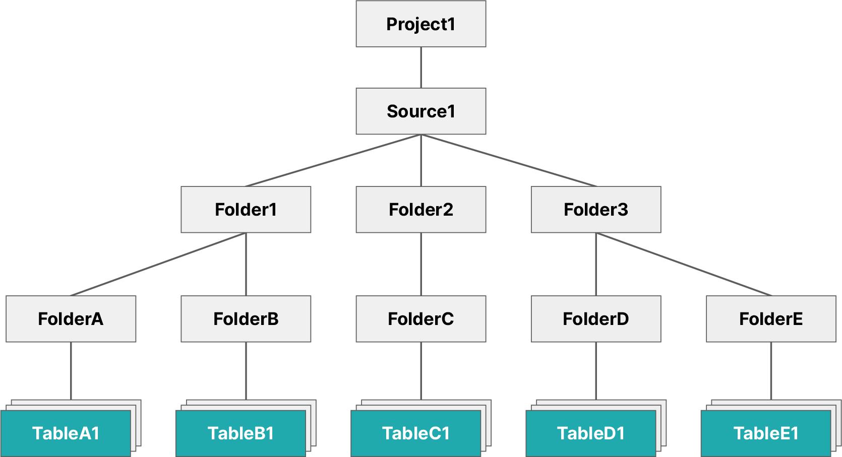 Each object, such as a project, cloud, or dataset, exists within a hierarchy of "containers." The uppermost container exists as the system administrator. All other objects are contained within sources or spaces and then organized into folders. The hierarchy of these objects is illustrated and described further on the Architecture help page.