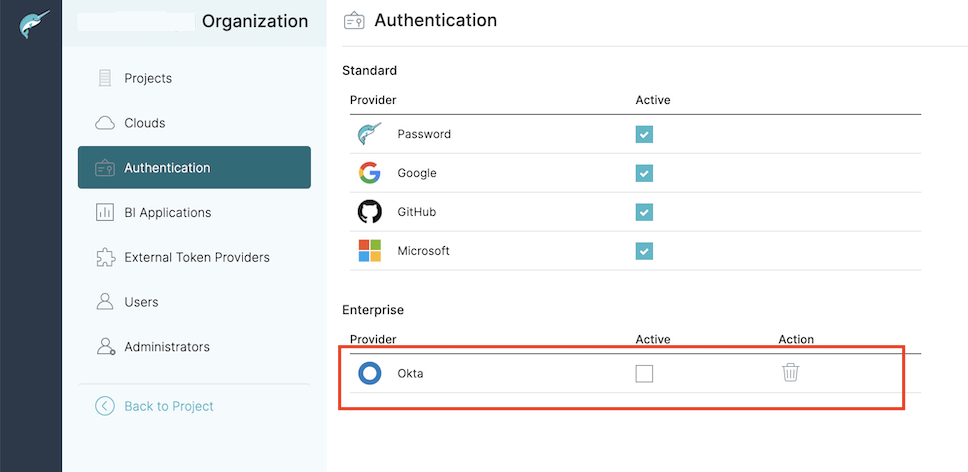 To activate the Okta enterprise IdP, select the checkbox under the Active column.