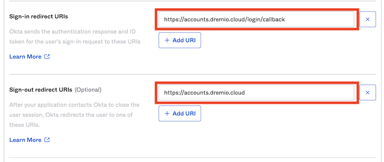 (Optional) For Sign-out redirect URIs, click + Add URI, and enter https://accounts.dremio.cloud to specify the sign-out redirect URI. This overwrites the default local sign-out redirect URI.