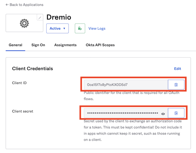 Copy the Client ID and Client Secret values. They are needed later to configure Okta in Dremio.