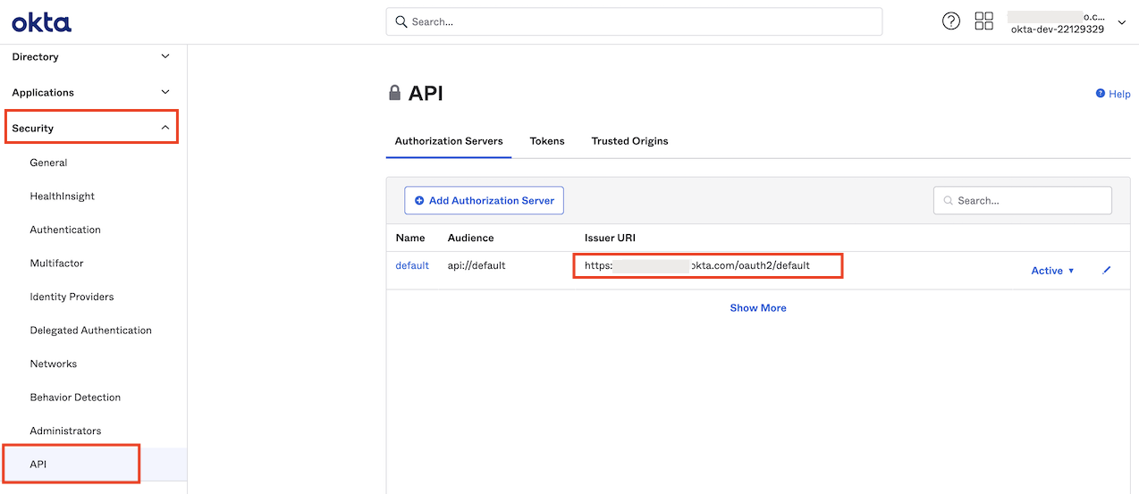From the API page, select the Authorization Servers tab and copy the Issuer URI from your default authorization server. This is likewise needed later to configure Okta with Dremio.