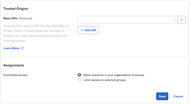 (Optional) Under Trusted Origins, enter the base URI for Base URIs (but only if you plan to self-host the Okta sign-in widget).