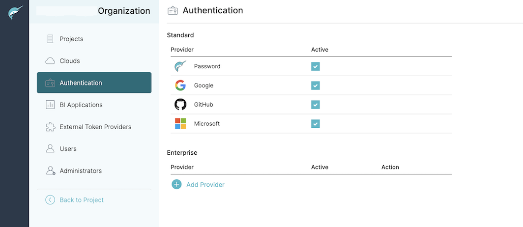 Click the Authentication tab from the left sidebar. Under the Enterprise selection, click Add Provider.