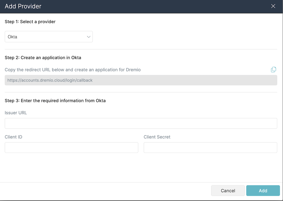 To configure Okta as an enterprise IdP, you must register Dremio as an application in the Okta organization and add Okta as a provider in Dremio. Once that is done, you may configure Okta to use SCIM for secure user provisioning.