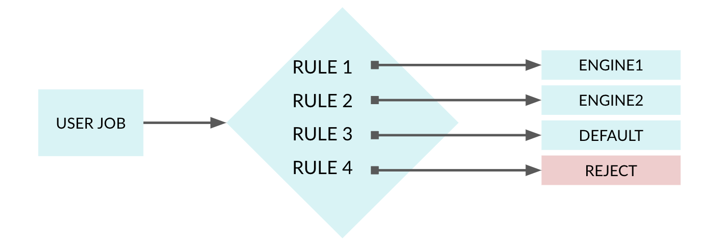 You must arrange the rules in the order that you want them to be evaluated. In the case that multiple rules evaluate to true for a given query, the first rule that returns true will be used to select the engine. The following diagram shows a series of rules that are evaluated when a job gets submitted.
