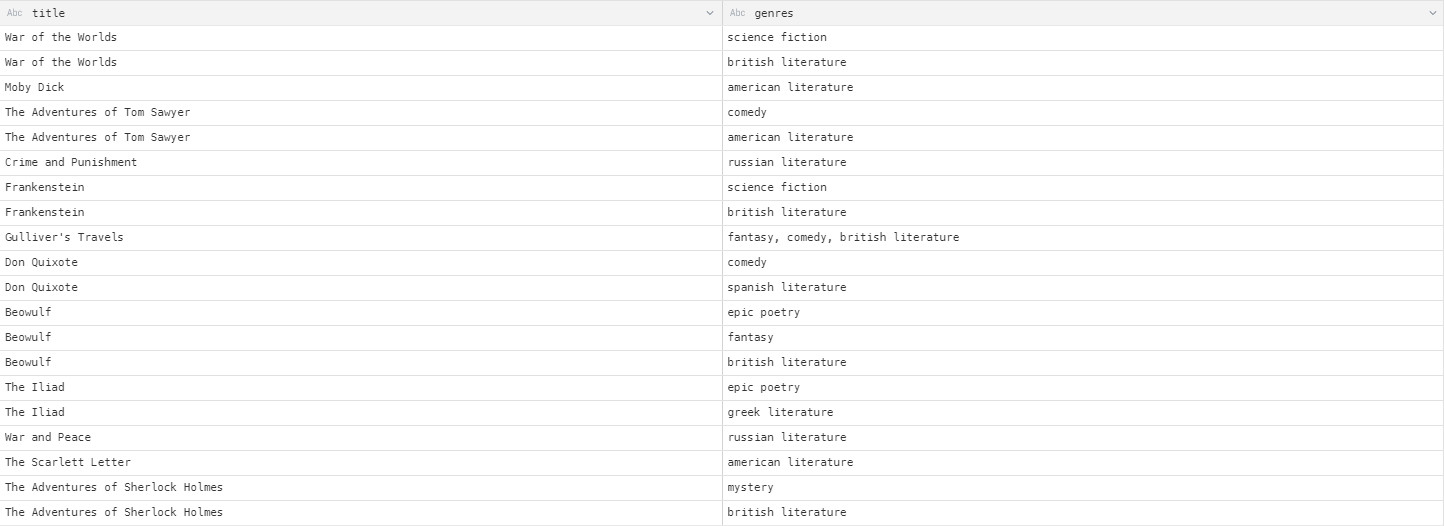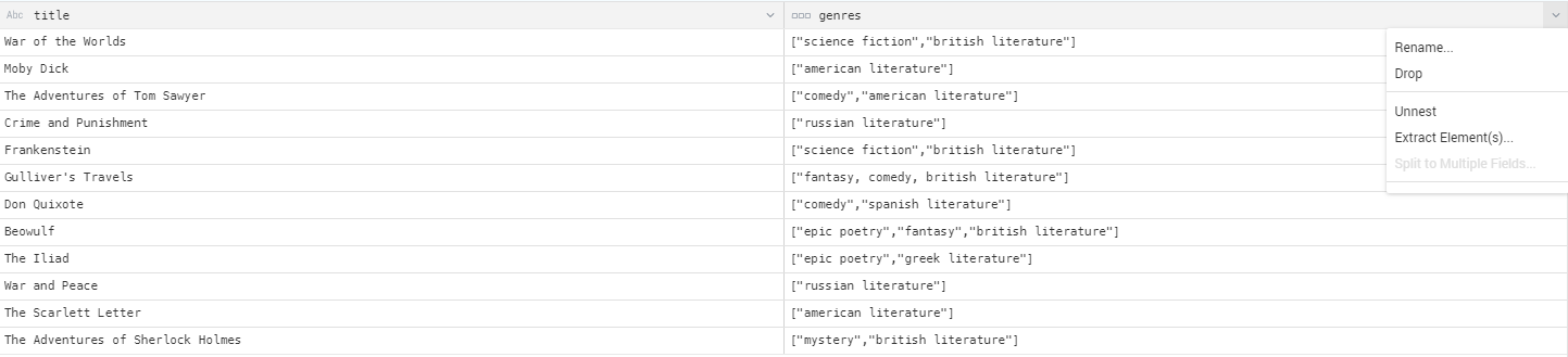 In this example we use Unnest on a field that contains a list of genres for each title in a database of books: