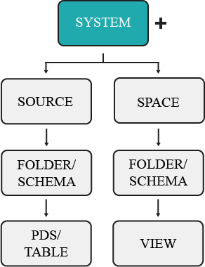 Each object resides within a container in a hierarchy of containers. The upper-most container exists as the system user, or administrator account. All other objects are contained within sources or spaces, organized into folders. The hierarchy of these objects is illustrated below.